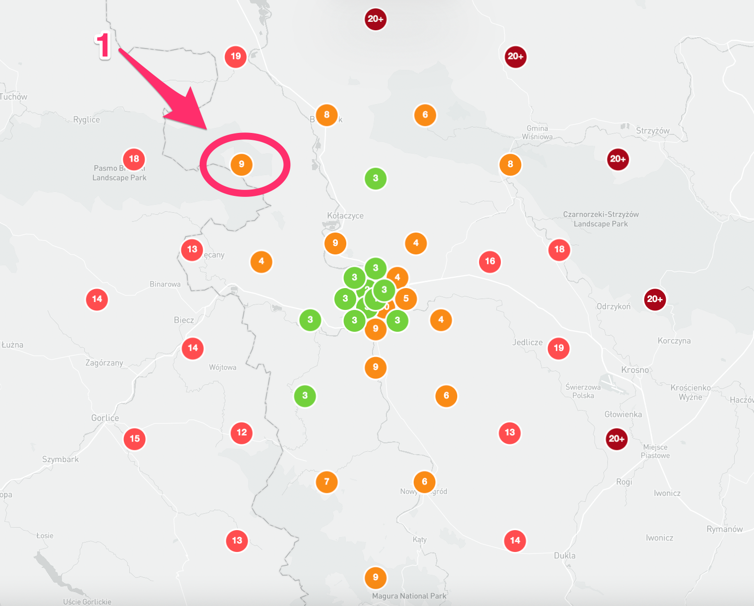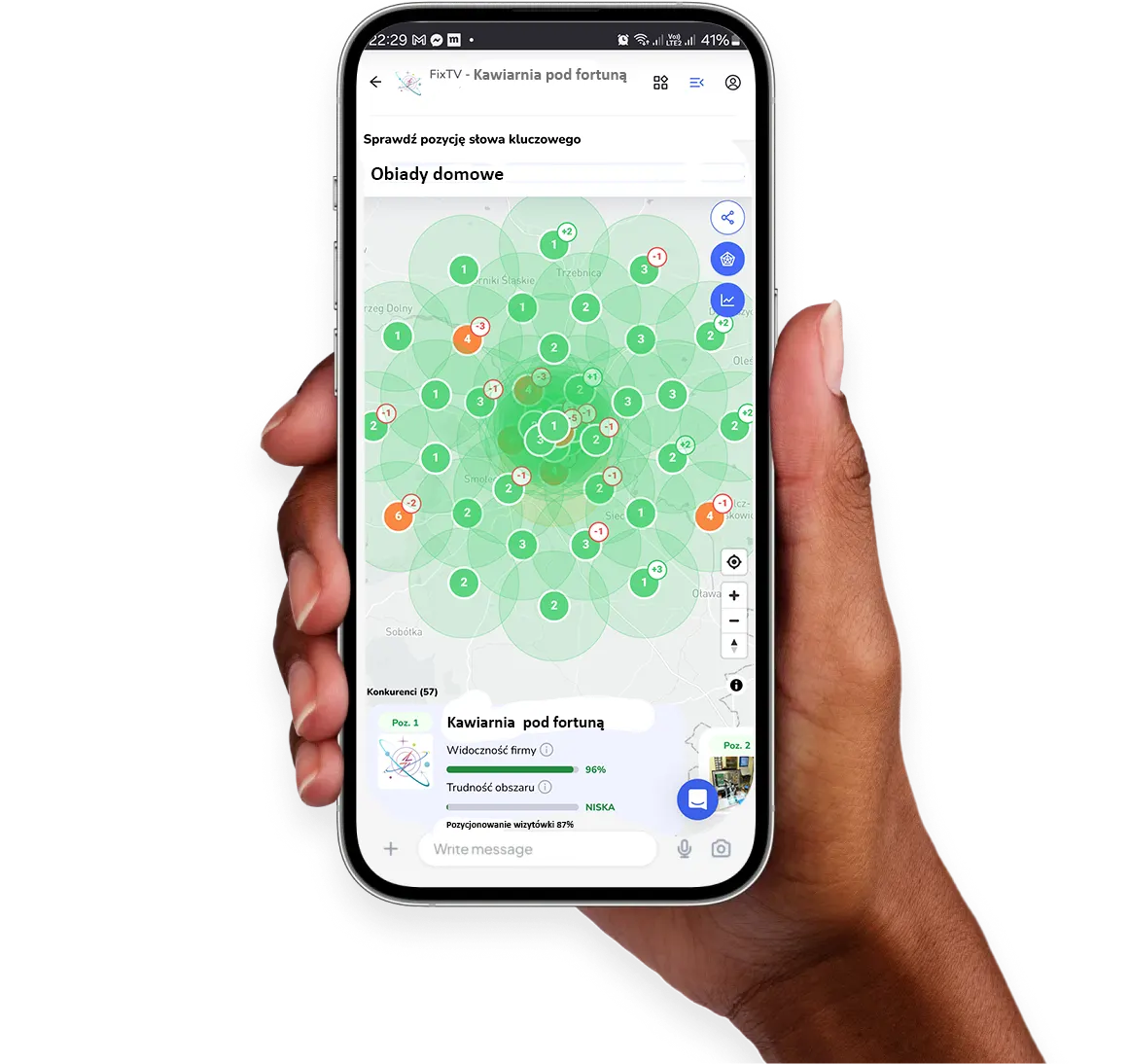 Każdy punkt z liczbą reprezentuje pozycję Twojej firmy/biznesu pod wybranymi słowami kluczowymi w określonych lokalizacjach.